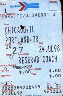 L'IDEA DATA PARTENZA DATA ARRIVO ITINERARIO TRENO 14/7/98 12/7/98 MIAMI - ORLANO SILVER METEOR 14/7/98 17/7/98 ORLANDO - LOS ANGELES SUNSET LIMITED 17/7/98 17/7/98 LOS ANGELES - OAKLAND COAST STARLIGHT (NORTHBOUND) 20/7/98 21/7/98 COLFAX - DENVER CALIFORNIA ZEPHIR 22/7/98 23/7/98 DENVER - CHICAGO CALIFORNIA ZEPHIR 24/7/98 26/7/98 CHICAGO - PORTLAND CALIFORNIA ZEPHIR 26/7/98 27/7/98 PORTLAND - OAKLAND COAST STARLIGHT (SOUTHBOUND) Parte 0I biglietti di questo viaggio