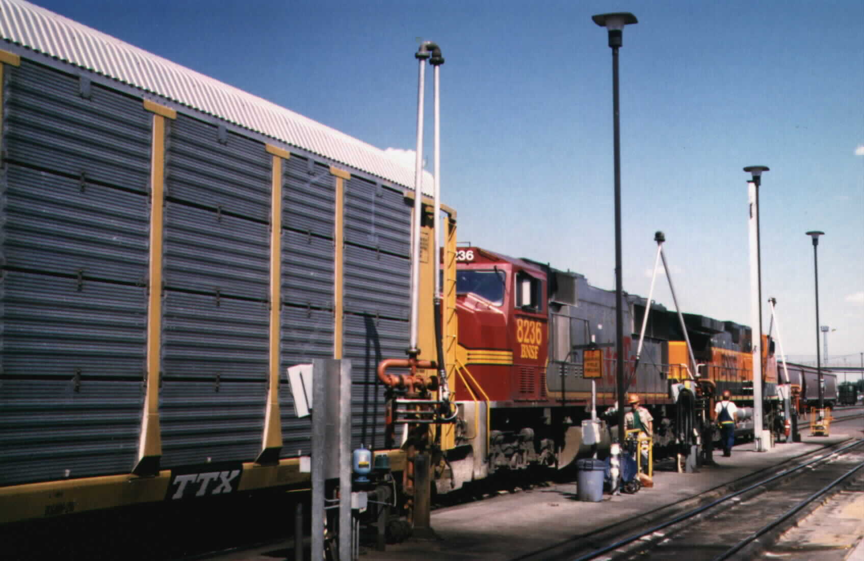 Parte 4Arrivati il pomeriggio di mercoledi' 15/7/98 alla stazione di New Orleans, rimasi un po' sorpreso: alla sontuosita' dell'atrio viaggiatori (tirato a specchio!) si contrapponevano marciapiedi in stato pietoso, pensiline da ..."speriamo stiano su intanto che ci passo sotto" e disorganizzazione e caos totale sul piazzale dei binari. Saliti sul treno veniamo informati che c'e' un problema: le due GE units assegnate al treno devono fare "il pieno" (sono circa 3.500 galloni ognuna), per cui il viaggio inizia con un paio di ore di ritardo!. Fantastica l'arrampicata del treno sul ponte di New Orleans sopra il Mississipi: su questo doppio binario transitano treni a distanza di blocco sino sull'altra sponda del fiume, dove dopo aver attraversato uno scalo la linea diventa nuovamente a binario unico. Sui binari ex SP, ora UP, il confort di marcia e' decisamente scadente: sono posati su traverse di legno in spezzoni da circa 9 metri (10 yards) e spesso le chiavarde che sorreggono il binario non hanno alcun chiodo che le fissi. L'esperienza di viaggiare su un binario che sta in posizione per ... gravita' e' sconquassante! Goduta un ottima cena nella dining car (piccola considerazione sul prezzo che si aggira intorno alle nostre 40.000.=: probabilmente optero' per qualcosa di diverso le prossime giornate), mi reco nella carrozza panoramica per godermi il passaggio del treno fra la rigogliosa vegetazione del sud della Luisiana e del primo tratto del Texas. La notte, passata sui sedili reclinabili della "coach class", e' decisamente molto piu' confortevole di quella passata fra i sedili di un bus, l'aria condizionata da brividi e una stazione di servizio nel nord della Florida il giorno prima. IL giorno successivo il vasto e selvaggio Texas mostra tutta la sua potenza: sembra non finire piu', anche perche', complice un'ondata di caldo eccezionale (si parlava di 120 gradi F), durante il pomerigio il treno si ferma in pieno deserto: la dilatazione del binario e' tale da non rendere "safety" la prosecuzione del viaggio, per cui si aspetta la notte in piena linea, bloccando il gia' congestionato traffico della UP nel sud del Texas. Infatti, attraversando il Texas, ho avuto la netta sensazione che i problemi lamentati dalla UP nella prima meta' dell'anno siano ben lontani dalla soluzione: siding riempiti sino alle traverse limite da 2/3/4 treni merci, scali al limite della loro capacita' ed ovunque, in generale, un senso di affollamento su questa linea a binario unico che attraversa gli stati del sud sino alla California. La notte fra il 16 ed il 17 di luglio passa via abbastanza facilmente, anche se fanno un po' impressione le tendopoli messicane viste dal treno (la zona e' illuminata a giorno!) che passa attaccato al confine messicano per diversi chilometri nei dintorni di El Paso... Purtroppo non riesco a vedere quasi nulla del New Mexico e dell'Arizona, e la mattina mi sveglio praticamente in California. Ci sono concitate consultazioni fra i conduttori: il motivo e' il ritardo del treno di circa 8 ore che non ci consente di mantenere la coincidenza a Los Angeles. La soluzione viene trovata: ad Indio i passeggeri diretti a Nord scenderanno dal treno ed un autobus inseguira' il Coast Starlight sino a San Luis Obisbo. Pazienza! Proprio a Indio, sperduta localita' in mezzo a piantagioni di datteri, ho assistito alla piu' incrdibile delle scene: il marciapiede di stazione e' lungo a malapena come una carrozza, per cui il treno si arresta con la prima carrozza in corrispondenza del marciapiede, quindi riparte per arrestarsi pochi metri dopo e far scendere i passeggeri della seconda e cosi' via! (avevo qualche dubbio sulla creativit? statunitense, mi sono stati sciolti tutti in un colpo!).