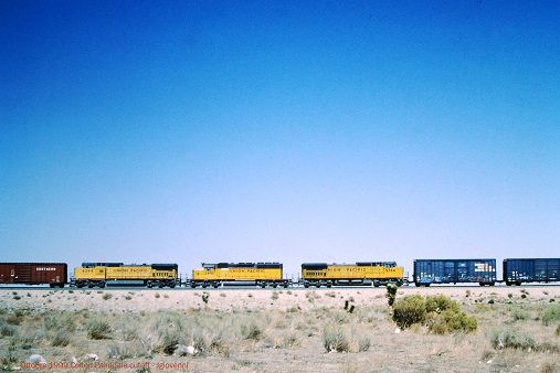 E finalmente... eccola la nostra preda di giornata: un manifest diretto nella California Centrale al traino di una GE C-40 dash 8. La fusione fra UP e SP è ancora piuttosto recente, come testimonia la seconda macchina del consist (GE C-44 dash 9) ancora nei colori Southern Pacific. |